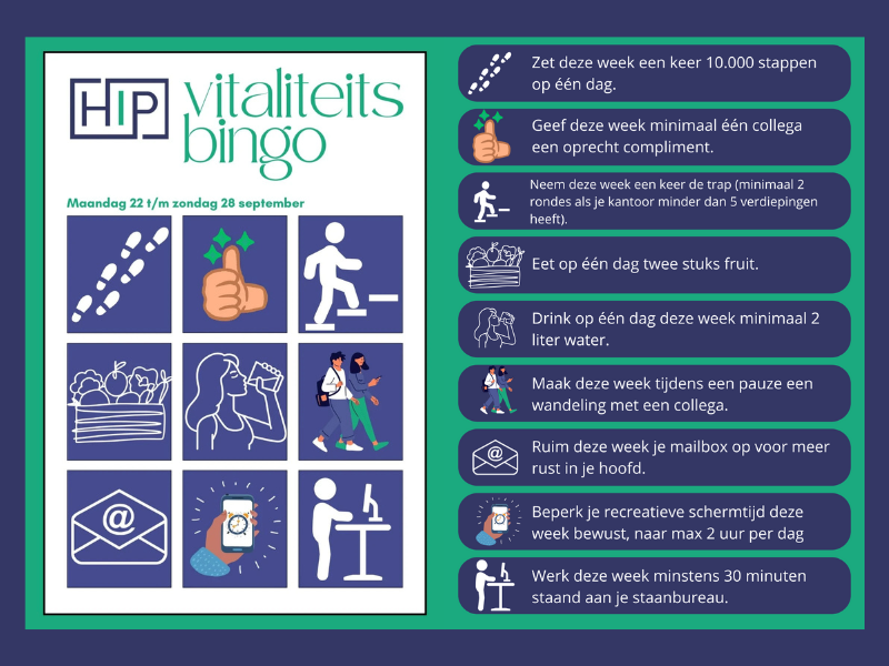 Op de bingokaart staan sportieve en leuke uitdagingen, zoals korte beweegmomentjes, ontspanningsoefeningen, gezonde keuzes en gezamenlijke challenges met collega’s. Zo dagen de HIPpers zichzelf uit om op een toegankelijke manier bewust en vitaal de week door te gaan.